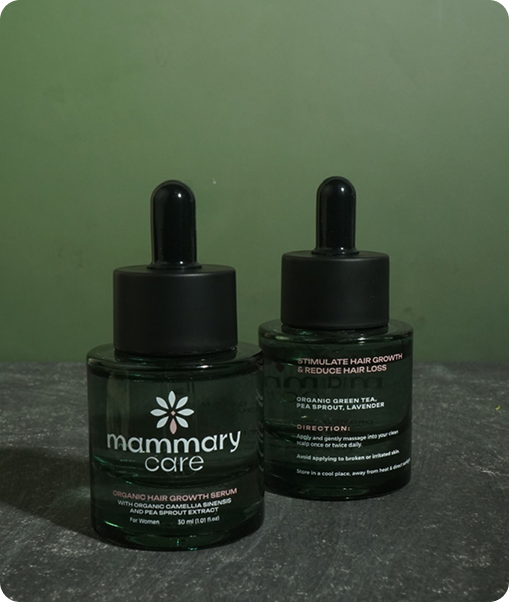 Mammary Care Hair Serum is water-based, non-greasy, and free from ingredients known to interfere with hormonal health—no alcohol, no silicones, no PEGs, no artificial fragrance.
